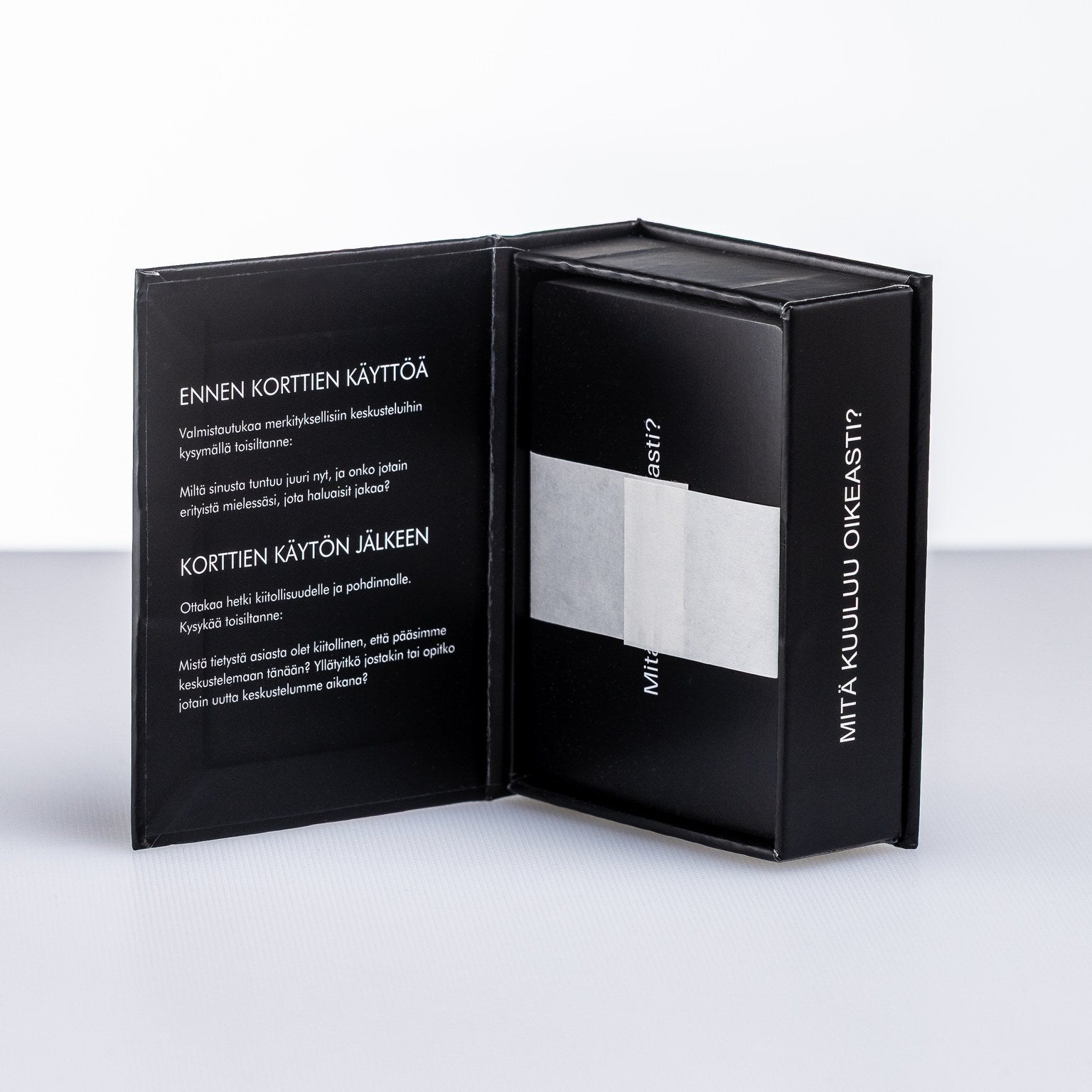 Tämä korttipakka on suunniteltu perheille, ystäville ja pariskunnille. Sen avulla voitte vahvistaa keskinäistä yhteyttänne jakamalla ajatuksia, tunteita ja kokemuksia turvallisesti ja avoimesti.